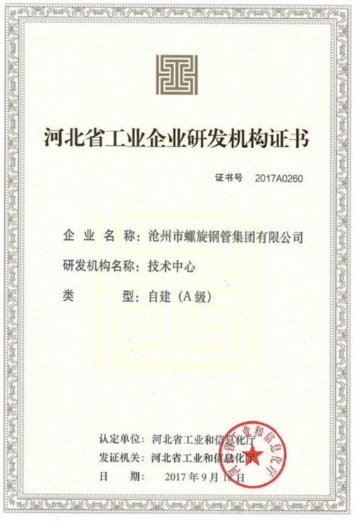河北省工業企業研發機構證書